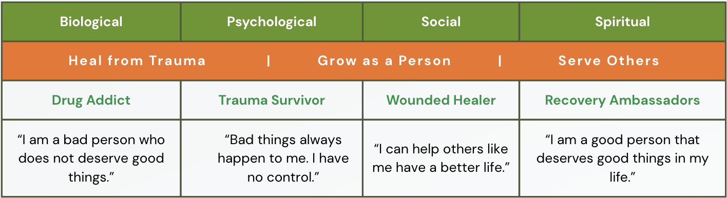 Through this model, we help our clients Heal from trauma, Grow as a person, and Serve others.